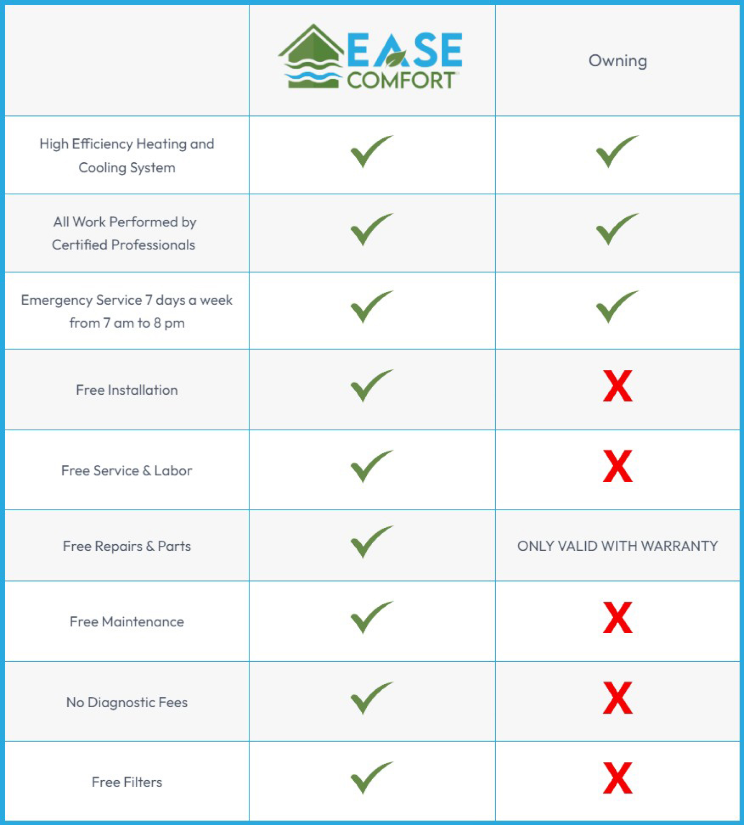 We designed the EASE Comfort Program to deliver comprehensive peace of mind through Complete Comfort Coverage, which means you never have to worry about the cost of repairs or routine maintenance.